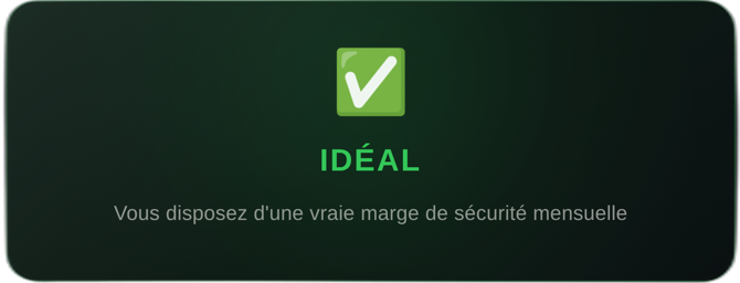 Votre solde bancaire vous dit combien vous avez, c'est une photo à l'instant T. Le Solde de Confort™ va bien plus loin : il analyse vos charges fixes, vos dépenses variables habituelles et votre marge de sécurité pour vous révéler si votre solde actuel est réellement suffisant pour vivre sereinement jusqu'à la fin du mois.